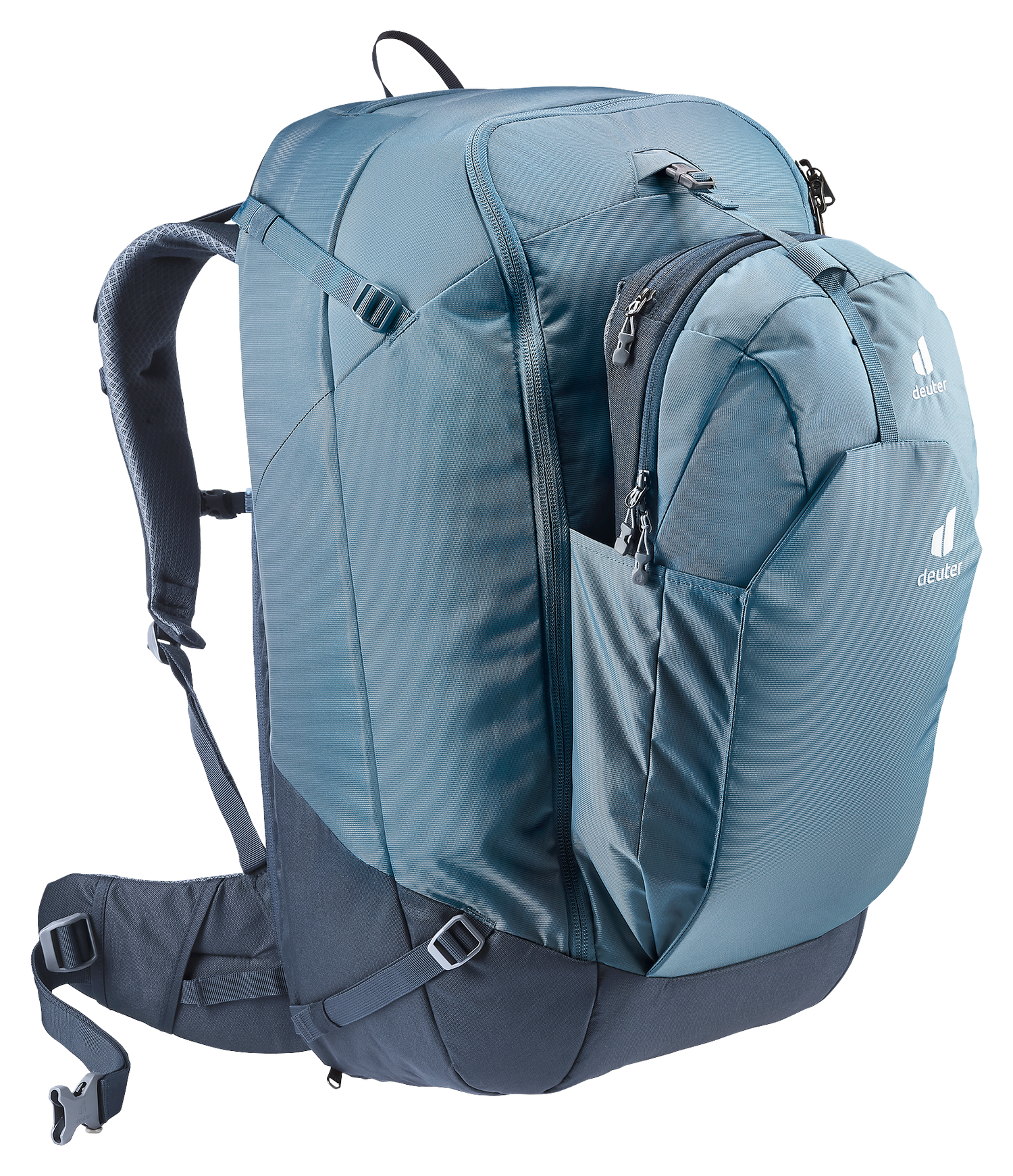 A bluesign® accredited product, this tough, sustainable pack is made from 100% recycled body fabric and features the deuter Contact back system for maximum carrying comfort. With a secure, lockable zipper on the main compartment, cleverly positioned compartments, and a removable shoe bag, this is a must-have piece of gear for world travelers. Including a day pack with padded back panel that can be worn on the front, clipped to the main pack's shoulder straps to keep valuables close at hand.